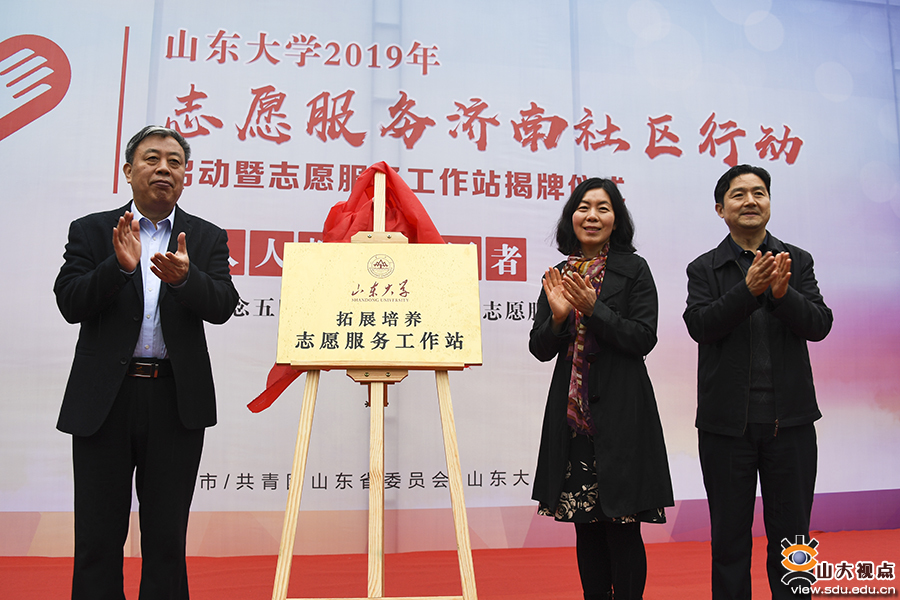 [本站讯]4月27日下午,由济南市、团省委和山东大学共同主办的山东大学2019年度志愿服务济南社区行动启动暨志愿服务工作站揭牌仪式在济南市洪家楼街道七里堡社区举行。山东大学校长樊丽明出席活动并讲话,校党委副书记仝兴华一同参会。济南市委常委、市总工会主席雷天太,共青团山东省委副书记李梦遥等出席仪式。