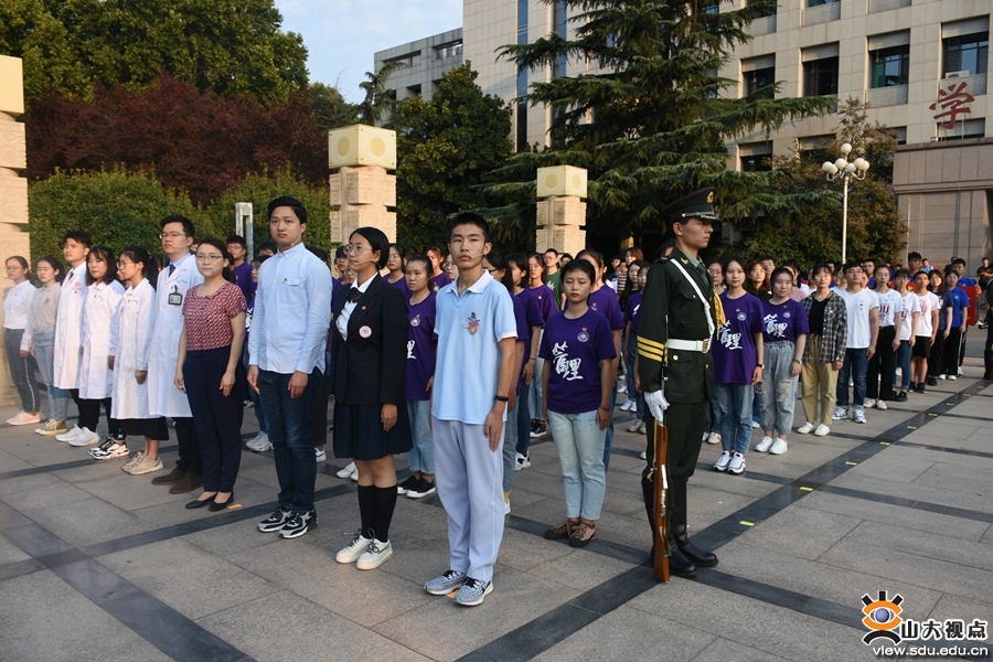 升旗仪式开始前,山东大学附属中学初中部学生张砺丹、山东大学附属中学高中部学生艾欣彤、临床医学院本科生曲泽瑞、后勤保障部幼教服务中心工作人员朱政、齐鲁医院普外科医生黄鑫代表山大青年为中华人民共和国成立70周年献上祝福,表示将用自己的奋斗和成就为祖国母亲献礼。随后,国旗护卫队迈着铿锵有力的步伐护送国旗进场。在庄严的国歌声中,鲜艳的五星红旗缓缓升起。活动由校团委书记张熙主持。