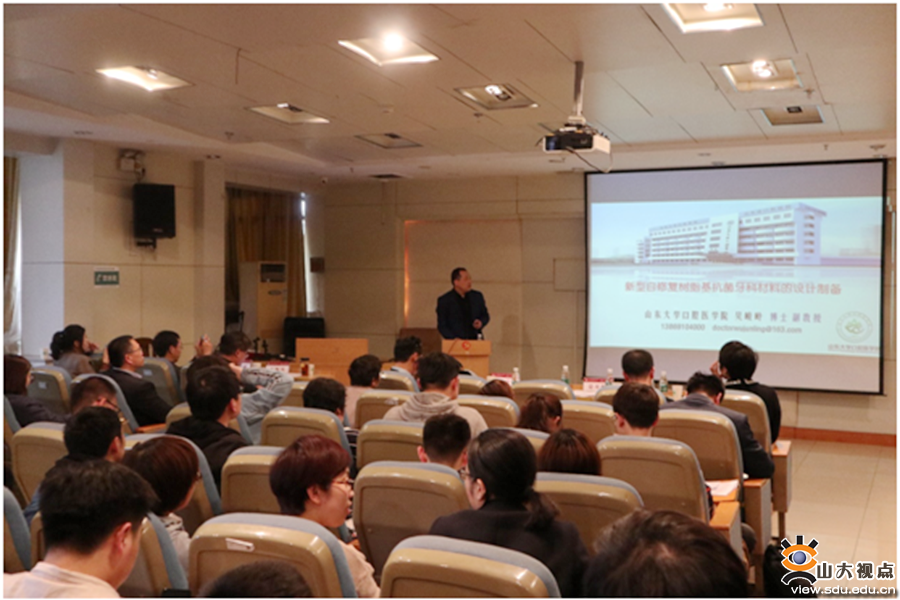 下午,论坛邀请了14位专家进行交流发言。口腔医学院葛少华教授,化学与化工学院刘鸿志教授,化学与化工学院鲁在君教授,机械工程学院黄俊教授,口腔医学院李建华教授、蓝菁副教授、吴峻岭副教授,分别作了题为“光催化二氧化钛纳米棒微阵列增强鈦表面的抗菌及促成骨效应研究”“倍半硅氧烷基功能材料在医学领域的潜在应用”“医用高分子材料”“功能表面制备中的界面作用力和界面现象”“生物材料与组织工程修复微环境构建”“当种植牙遇上3D打印”“新型自修复树脂基抗菌牙科材料的设计制备”的发言。齐鲁医院副主任医师司海朋、口腔医学院副主任医师刘毅、晶体材料研究所王蕾副教授、晶体材料研究所夏金宝、材料科学与工程学院王协彬副研究员、机械工程学院任冰、晶体材料研究所李雪松分别作了题为“3D打印陶瓷泡沫墨水制备骨科材料”“Nanosilver/PLGA co-coatings on implant surfaces for the enhancement of antibacterial properties and osteoinductivity/纳米银/PLGA共涂层种植体的抗菌与骨诱导研究”“浅谈药物多晶型”“Detection of disease biomarkers in breath gases by laser spectroscopy”“镍钛形状记忆合金及其激光增材制造”“生物医用钛材表面改性与生物相容性研究”“新型二维晶体量子点在肿瘤治疗上的研究”的交流。
