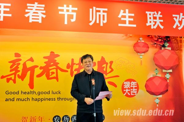 王琪珑代表学校向寒假坚守岗位的老师、留校过年的同学致以节日问候。他说,在春节这个举家团圆的日子里,同学们因为学习、实习、求职等各种原因无法与亲人团聚,山大就是你们的家,学校为你们准备了丰盛的年夜饭、精彩的歌舞表演和年货大礼包,希望大家开心、尽兴。王琪珑简要回顾了过去一年学校取得的成绩,表示累累硕果让我们备感欣慰。他说,2016年,学校将最大程度地为学生们改善学习、生活条件,推进不同校区间的资源共享,更加注重民主管理与民主监督,还将正式启用青岛校区,迎来首批入驻新生,实现一校三地办学。他号召大家团结一致,以更强的拼搏精神、更高的工作热情,全面推进世界一流大学建设,为努力实现“中国梦•山大梦”作出新的贡献。