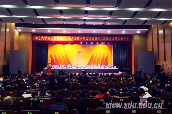 [本站讯]1月22日上午,山东大学第三届教职工代表大会第一次会议暨第十八次工会会员代表大会在中心校区开幕。校党委书记李守信致开幕词,校长张荣正在作学校工作报告。