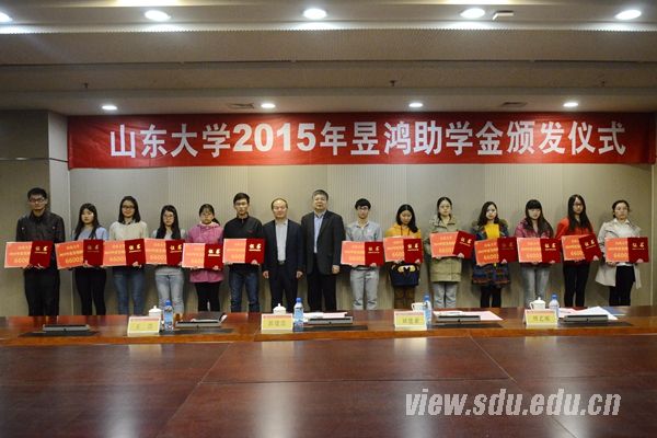 [本站讯]11月11日,山东大学2015年度昱鸿助学金颁发仪式在中心校区举行。山东省教育厅副厅长郭建磊、山东大学副校长刘建亚出席仪式,并为本年度受助学生颁发证书。
