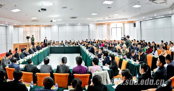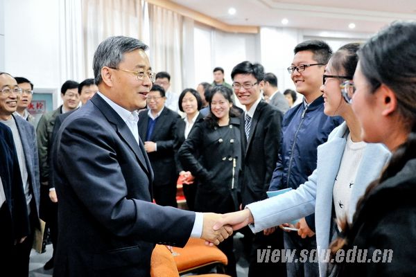 座谈会上,郭树清与师生代表互动交流。大家争相提问,现场气氛热烈。郭树清对师生们提出的结构转型升级、大学生就业创业政策、高校改革发展、进一步扩大对外开放、加强精神文明建设、文化创意产业发展等问题进行了深入解答。在回答山东师范大学教育学院2013级研究生杨璐的问题时,郭树清说,大学毕业生到基层锻炼,既是挑战也是财富,对将来成长大有帮助。在回答齐鲁工业大学轻工学部2013级本科生温博晗关于大学生创业创新提问时,郭树清与大家分享了自己的亲身经历,勉励大学生敢闯敢试,勤奋学习,刻苦努力,在实践中不断提升创业创新能力。在回答山东建筑大学教师刘海霞的问题时,郭树清说,开放是国家繁荣发展的必由之路,只有开放才能更好地推进创新和转型升级,才能维护国家核心利益,建设创新型国家必须不断扩大开放。