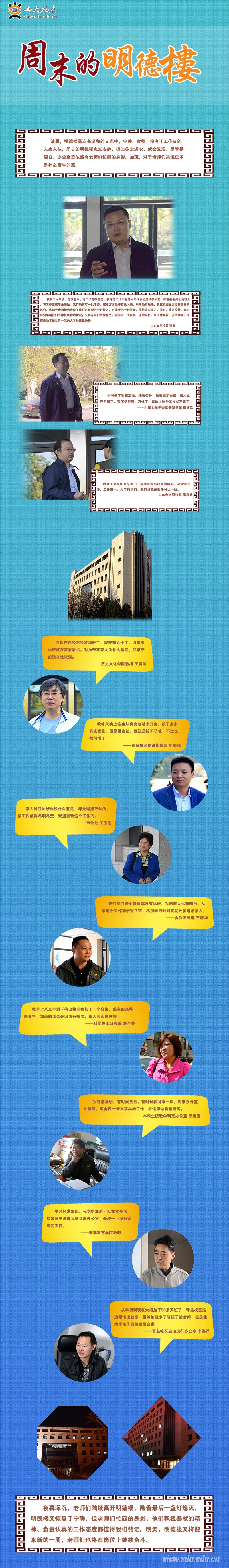 编者按:当前,山东大学正处于创建世界一流大学的重要时期,通过制定《综合改革工作方案》、制定十三五规划等一系列重要举措,学校发展远景以及规划目标已渐渐清晰明确。在世界一流大学建设的征途上,广大师生正在为实现该宏伟目标努力奋斗着,都在各自的岗位上,以良好的精神面貌,饱满的工作干劲,创新的思想观念,凝心聚力,推动学校各项事业科学跨越发展。学者们潜心学术、教师们悉心育人、同学们用心学习,山大人已经将奋斗当作了一种习惯,把学习作为了一种生活方式。同时学校机关干部也在提高服务意识、创新工作模式,为师生们提供最优质的服务。本期报道我们把镜头锁定在周末的明德楼,从机关作风建设这个视角,来观察学校机关工作人员的服务意识,展现他们干事创业的工作热情。