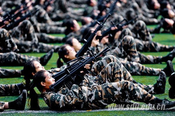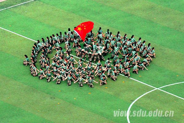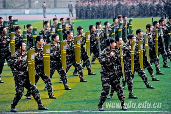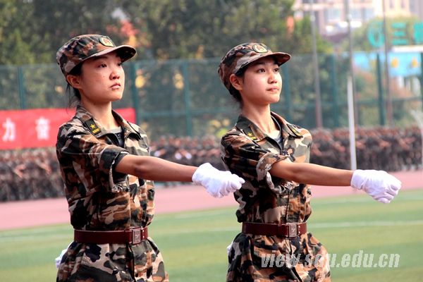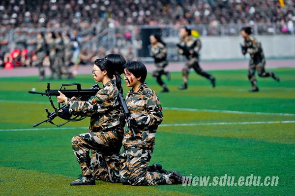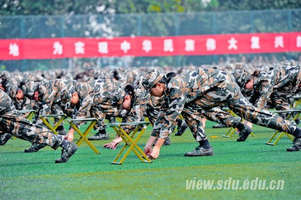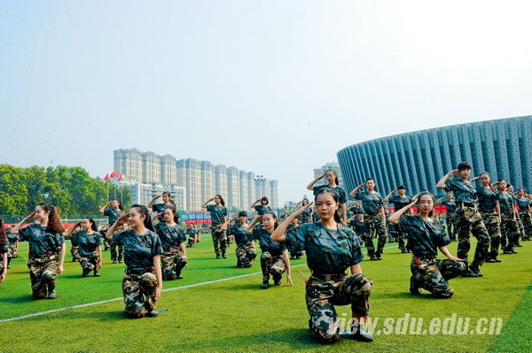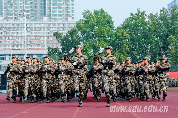 国歌嘹亮,红旗飘扬。阅兵典礼分为阅兵式、分列式和汇报表演课目三部分,由济南军区驻山东大学选培办主任王强上校担任阅兵总指挥。阅兵式上,吴巨峰等徒步绕场一周,检阅了各新生方队。同学们身着戎装,精神饱满,高声应答,以挺拔的军姿和高昂的士气书写了一份光荣的答卷。在分列式中,国防生持枪方队等二十三个方队依次走过主席台。他们步履铿锵,气宇轩昂,英姿勃发,口号嘹亮,用汗水铸造了钢铁般的脊梁。接下来的汇报表演课目气势宏大,精彩纷呈。一营的女兵风采方队,迈着坚强自信的步伐,面带阳光美丽的笑容,严肃不失活泼地舞动在绿茵场上。二营的表演课目是军体拳方队和特种战术方队。军体拳方队冲拳别臂,击腰锁喉;勾拳顶肘,擒拿格斗。疾如风,徐如林。特种战术方队矫健的步伐,强健的身姿,无不展现出战士的勇敢和军人的刚毅。三营表演的课目是倒功和女子防身术组合方队。倒功和女子防身术的表演可谓是,千磨万击利刃铸,万练千锤武艺精。四营表演课目是正规化养成方队。方队用标准的动作、完美的配合给20天的训练画上一个完美的句点。五营表演课目是防暴术方队。防暴术方队表演的警棍盾牌操共由十二组动作构成,分别为劈弹戳击、上挑下切、撩劈下砸、左挡抡扫、横踢推击、抡扫下劈、左挡抄击、转身劈推、侧踹前戳、侧摆劈击、右格横扫、上架劈击。