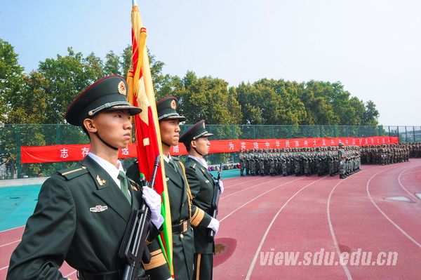 [本站讯]9月25日,山东大学中心校区体育场锦旗飘扬,口号震天。在国庆节即将到来之际,山东大学2015级新生军训阅兵典礼在此隆重举行。山东大学党委书记李守信,山东省军区政治部副主任吴巨峰大校,济南军区政治部干部部人才办管恩松大校,济南警备区副司令员崔振林大校,山东大学常务副校长王琪珑、党委副书记仝兴华、总会计师曹升元出席典礼。仝兴华主持典礼。
