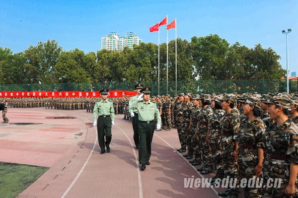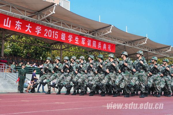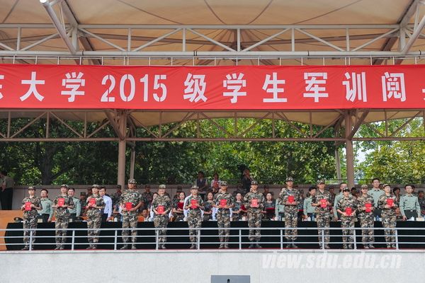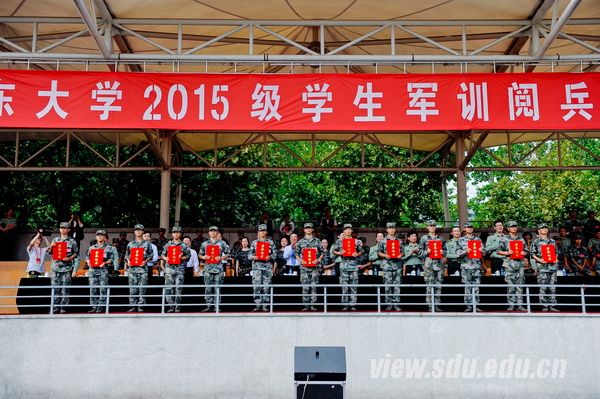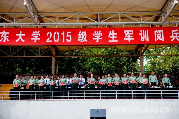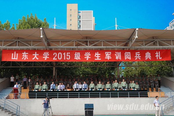 中国人民解放军71777部队部队长黄龙强上校,历城区人民武装部部长卢国华中校、政委禚红武上校,济南军区、山东省军区、济南警备区、历城区武装部、山东大学有关部门负责人,承担今年军训任务的国防生,全体参训政工干部,2015级全体本科生参加了阅兵典礼。