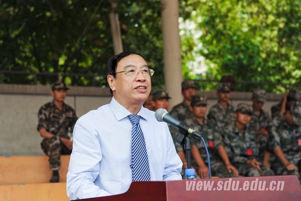 李守信在致辞中向一直支持山大工作的济南军区、山东省军区、济南警备区各级领导和同志们表示感谢,向今年承担军训任务的国防生骨干、学生工作干部以及为军训提供有力保障的各职能部门、各学院同志们表示问候,同时祝贺2015级新生顺利完成了军训任务。李守信说,国防教育和军训工作是关系到国家安全和繁荣的一项基础性、长期性的战略工程,是国家人才培养战略和国防后备力量建设的重要组成部分。学校历来重视学生国防教育和军训工作,不断创新形式和内容,提高工作质量,得到教育部等上级部门的充分肯定。今年是中国人民抗日战争暨世界反法西斯战争胜利70周年,为隆重纪念这一历史时刻,国家举行了盛大的阅兵典礼,为的是铭记历史、缅怀先烈、珍爱和平、开创未来。今年还是国家开展学生军事训练三十周年,在这样的背景下完成军训任务,更能激励大家继承和发扬革命先烈的革命精神和优良传统,更加奋发有为地投身到中国特色社会主义事业的建设中去。当前,全党全国正在“四个全面”战略布局下,积极推动改革开放和社会主义现代化建设,为实现中华民族伟大复兴的“中国梦”而奋斗。正如习近平总书记强调的,“中国梦是国家的、民族的,也是每个中国人的;中国梦是我们的,更是你们青年一代的。”作为青年一代的佼佼者,应自觉担负起实现“中国梦”的伟大使命,牢固树立以爱国主义为核心的民族精神,以改革创新为核心的时代精神,不断增强责任感和使命感,努力学习,练就过硬本领;勇于创新创造,争做时代先锋;矢志艰苦奋斗,成就个人梦想。李守信希望同学们巩固军训成果,在新的学习生活中继续保持军训形成的好习惯、好作风,将军训的收获内化为自己的基本素质,坚持远大理想、刻苦学习、艰苦奋斗、开拓创新、高尚品行,努力成为中国特色社会主义事业的合格建设者和可靠接班人。