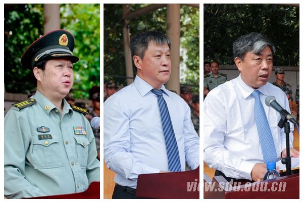 山东省军区政治部副主任吴巨峰大校(左)在典礼上致辞、山东大学常务副校长王琪珑(中)宣读《山东大学关于表彰2015级学生军训先进集体和优秀个人的决定》、山东大学党委副书记仝兴华(右)主持典礼