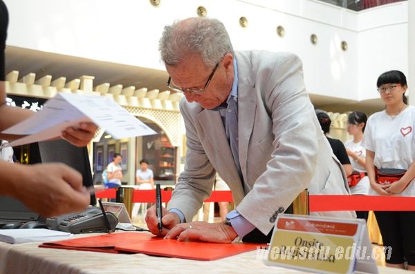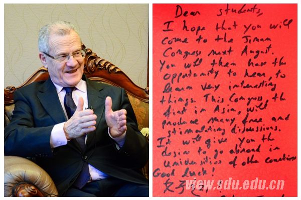 思维严谨清晰,待人亲切热情,带着法国绅士的风度,这是这位历史学家给人的印象。犹记得采访结束后,弗兰克应邀给山大学子题词,又特意写下中文汉字:“好运!”在询问身边的人写得正不正确后,他又一次爽朗地笑了。他的赠言也和他在交谈中的言语一样令人鼓舞:“致山大学子:希望你们可以到济南大会来。你们将有机会聆听、学习到非常有趣的内容。这是大会首次在亚洲举办,会上将有很多自由讨论,这会让你们产生到国外其他高校交流的愿望。祝你们好运!”