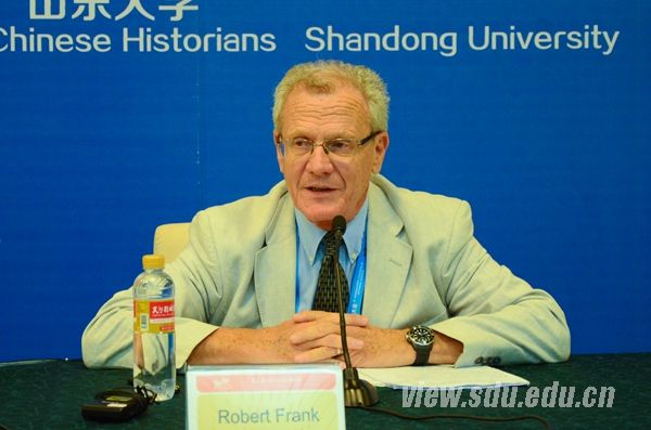 在第22届国际历史科学大会开幕式前新闻发布会上,国际历史学会秘书长罗伯特·弗兰克在接受媒体采访时表达了对中国的关注:“中国在世界战争中的地位已引起国际历史学家的关注,西方学者期待在第22届国际历史科学大会中就此话题展开交流。”早在今年1月的大会新闻发布会期间,弗兰克在接受山大视点记者采访时就对中国参会学者充满期待,也认为“济南是国际历史学会的正确选择”。这位儒雅的老先生一提到和历史研究相关的问题就眉飞色舞,神采奕奕。他是法国著名的国际关系史专家,在巴黎一大任教。巧合的是,他在法国作为导师指导的中国学生仅有两人,而这两人全都在山东大学任教。也许是因为他与山大特别的渊源,他在采访中很快就打开了话匣子。