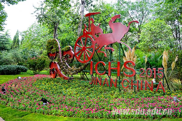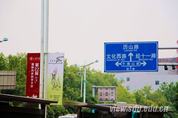 山东大厦对面有醒目的国际历史科学大会LOGO标志,进入大厦迎面可见欢迎牌,稍远一些,泉城公园东南角的花坛里,矗立起了庆祝大会隆重召开的景观设计,吸引了众多市民驻足观看。