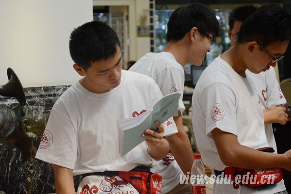在山东大厦一楼的注册报名处,工作人员细致介绍了学者进入大厦后的引导流程,现场分设中外嘉宾注册区、综合服务区以及休息区,将有六个服务窗口同时接受注册,来自各学院英语水平较高的学生志愿者以及十余位工作人员将为与会学者提供服务。目前注册组工作人员正在搭建注册工作台,明天将进入实战演练。此外,嘉宾疏导分散工作已准备就绪,安保组工作人员根据安保手册中的详细分工进行了现场演练。山东大学组委会有关小组工作人员及志愿者、济南市公安局有关工作人员参加活动。