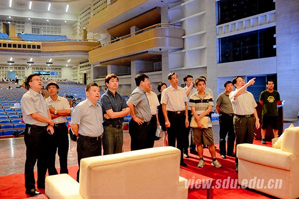 预演活动从山东会堂的入口处开始。开幕式当天,与会学者和嘉宾将在这里接受安检然后进入会场。在现场,领导们详细询问了大会安检情况,并进入山东会堂视察开幕式会场布置情况,观看大会宣传片,对背景展板、主席台设置等提出了具体的指导意见。随后,领导们仔细询问了宴会餐饮工作情况,对餐饮台面设计、大厅电子屏测试以及宣传册准备等问题提出了明确要求。