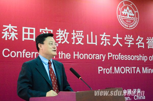 张荣在致辞中对森田实教授给予山东大学的关心和支持表示感谢。他说,森田实教授不仅是一位知名的政治评论家,还是一位有着丰富学术修养以及独到学术见解的学者。为表彰森田实教授的杰出成就以及对山东大学所作出的积极贡献,山东大学特聘请森田实为山东大学名誉教授。相信通过聘任森田实名誉教授,将会对山东大学相关学科建设起到良好的促进作用。