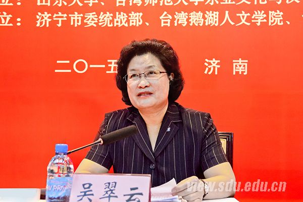 吴翠云首先代表中共山东省委、省委统战部、省海外联谊会对本期论坛的举办表示热烈的祝贺,向与会嘉宾表示诚挚的欢迎。吴翠云表示,举办鲁台中华教育论坛,就是为两地教育界提供一个交流沟通的平台,使其共享基础教育发展的经验与成果,共同创造鲁台基础教育的美好明天,为促进两岸关系和平发展作出贡献。她希望山东与台湾的同胞携手面对未来,沿着两岸关系和平发展的正确方向,不断谱写两地文化教育交流合作的新篇章,为建设两岸同胞共同的精神家园作出应有的贡献。