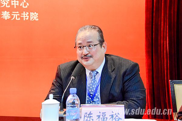 陈福裕在致辞中对中共山东省委统战部、山东省海外联谊会和山东大学给予的支持表示衷心感谢。他谈到,创新和复兴儒学,建设好当代儒学,对于弘扬中华文化,培固民族文化的主体地位,培育和振奋民族精神,解决文化认同和信仰危机,具有巨大的现实意义和长远的战略意义,需要两岸儒学学者共同的历史担当。