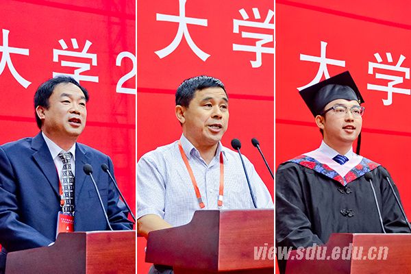 校友代表、机械工程学院79级校友、山东豪迈集团股份有限公司董事长张恭运(左),教师代表、工程训练中心陈言俊教授(中),毕业生代表、文学与新闻传播学院2011级本科生云帆(右)先后致辞