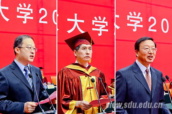 副校长张永兵(左)宣读《山东大学关于表彰优秀毕业生和赴西部、基层、国家重点行业就业毕业生的决定》,副校长陈炎(中)宣读《山东大学2015届毕业生学位授予决定》,校领导方宏建(右)主持毕业典礼