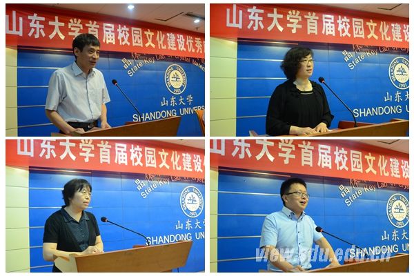 [本站讯]5月29日,山东大学首届校园文化建设优秀成果表彰暨工作研讨会在中心校区举行,校党委常务副书记李建军出席会议并讲话。 李建军简要回顾了山东大学校园文化建设三期工程,对学校自2003年实施工程以来,在精神文化建设、制度文化建设、环境文化建设、行为文化建设等各项工作中取得的成就予以充分肯定。他着重对做好当前校园文化建设工作提出五点意见,一是强化责任意识,坚持齐抓共管;二是强化价值引领,坚持育人为本;三是强化自觉自信,坚持协同创新;四是强化载体建设,坚持多元支撑;五是强化成果积累,坚持品牌培育。 山东大学宣传部部长、校园文化建设办公室主任李平生主持会议,并就如何做好校园文化建设工作谈了感想和体会。李建军、李平生为各获奖单位代表颁发证书。此次会议表彰了在首届校园文化建设优秀成果评选活动中获奖的36项成果,学工部、研工部、文学院、新闻中心等部分获奖单位代表进行经验交流发言。全校各单位党委、党工委、党总支、直属党支部,校部机关、直属附属单位相关负责人参加会议。 为深入学习贯彻党的十八大和十八届三中、四中全会精神,深化社会主义核心价值观和中华优秀传统文化宣传教育,培育校园文化品牌,推进校园文化建设,山东大学于今年3月到5月期间开展了首届校园文化建设优秀成果评选活动。全校各单位积极申报,成果形式涵盖理论与学术类、声像类和活动类,内容涉及主题教育活动、校风学风建设、文化载体建设、文化艺术活动、实践育人等多方面。党委宣传部(校园文化建设办公室)组织相关专家学者成立专家评审委员会,经评议,最终评选出特别奖1项、一等奖5项、二等奖10项、三等奖20项计36项获奖成果,活动取得良好效果。