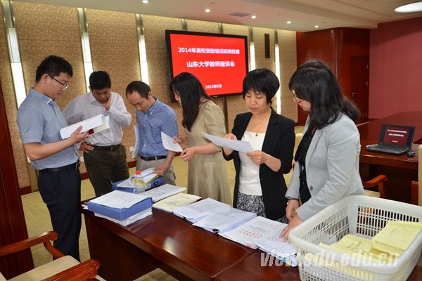 汇报会后,检查人员与教师代表和学生代表进行座谈,就山东大学的学费标准、生均资助力度、发展性能力资助、学生大病救助保障措施等进行了详细问询,就助学贷款、基层就业代偿等工作中面临的实际问题进行了讨论交流,并就学生资助政策的落实情况进行了调研,现场进行问卷调查。随后,检查组查阅了山东大学学生资助相关制度文件以及2014年奖助资金账目和发放凭证原件,并对学生资助工作的办公条件进行实地检查。