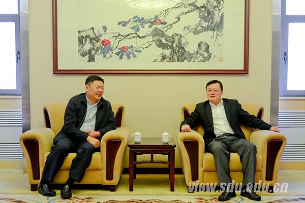 山东大学校长张荣(右)会见了新疆昌吉学院院长冯武生(左)一行
