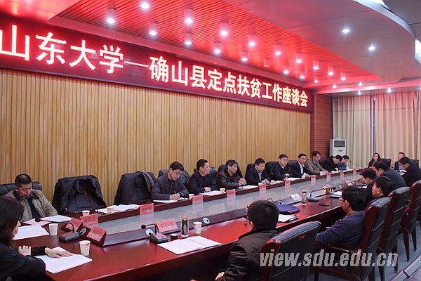 座谈会上,曹升元回顾了两年来山东大学定点扶贫工作开展情况。他表示,双方要进一步加强沟通与交流,根据确山实际需求,更好地发挥山东大学的科技人才优势,在科技、教育、医疗等方面重点突破,把定点扶贫工作做实做好,不断增强确山自我发展能力,帮助确山县贫困群众脱贫脱困;要充分发挥山大校友的作用,为定点扶贫工作开辟更广领域。确山县委书记栗明伦表示,山东大学为帮扶确山县做了大量工作,促进了确山县经济社会发展;希望山东大学在教育、卫生、科技等领域继续加大支持力度,提升确山的教育水平,促进科技成果到确山转化,提升传统产业,发展新兴产业。确山县县长路耕介绍了确山县基本情况,两年来扶贫开发工作成效和存在的问题,并对下一步山东大学帮扶确山县提出了建议。