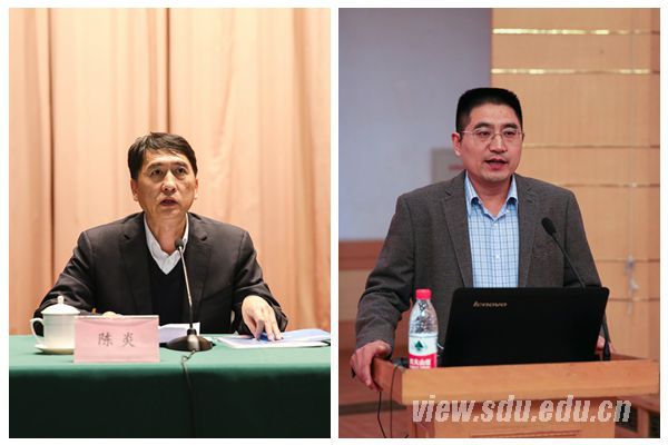 山东大学副校长陈炎(左)致开幕词,教育部大学生物学课程教指委副主任委员、华中农业大学江珩研究员(右)作总结发言