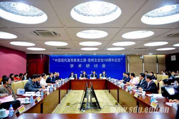 [本站讯]10月6日,由山东大学举办的“中国现代高等教育之源——登州文会馆150周年纪念”学术研讨会在中心校区举行。山东省委常委、宣传部长孙守刚,教育部社科司司长张东刚出席研讨会并致辞。立青文教基金会大陆地区代表、中国社会科学院世界宗教研究所研究员叶涛,登州文会馆校友、山东大学堂教习仲伟仪之孙仲维畅分别发言。山东大学党委书记李守信主持开幕式,校长张荣代表学校致辞。国家外专局信息中心主任陈化北,南京大学党委副书记朱庆葆,山东大学党委常务副书记李建军、副校长陈炎出席研讨会。