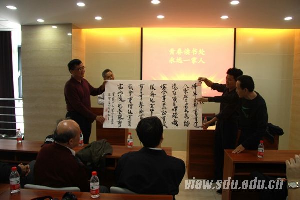 山东大学文学院院长郑春在致辞中向大家介绍了学院近年来在教学科研、学科建设等方面取得的成绩,感谢校友们在学院发展建设的关键时刻给予的大力支持和真诚帮助。80级辅导员解洪祥教授与大家共同回忆了曾经的大学生活,为同学们的成长与发展感到骄傲与自豪。他勉励校友们更加勤奋学习、扎实工作,以优异的工作业绩回报学院和社会。座谈会后,校友们向学院赠送了自己创作的诗歌与书法作品。活动期间,校友们还共同漫步校园,在承载无数青春记忆的小树林和文史楼,久久驻足。