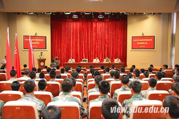 会议由党委研究生工作部部长王君松主持。中国人民解放军驻山东大学选培办主任王强上校出席会议并向各营授营旗。本科生院院长胡金焱宣读了军训团成立暨任命团级干部的决定,王强担任2014级学生军训团团长,党委学生工作部副部长王浩担任军训团政委。王浩宣读了任命军训团营级干部的决定。教官孙智彬代表执训教官庄严承诺,将牢记职责,以饱满的热情投入到军训工作中,不怕苦、不怕累、高标准、高质量完成军训任务。政工干部代表、公卫学院党委副书记李士保在发言中表示,要向人民解放军学习,在军训中做好思想引导和后勤保障工作,团结一致、共同努力,确保军训工作取得圆满成功。中国人民解放军驻山东大学选培办、山东大学有关部门负责人、全体执训教官和参训学生工作干部参加了大会。