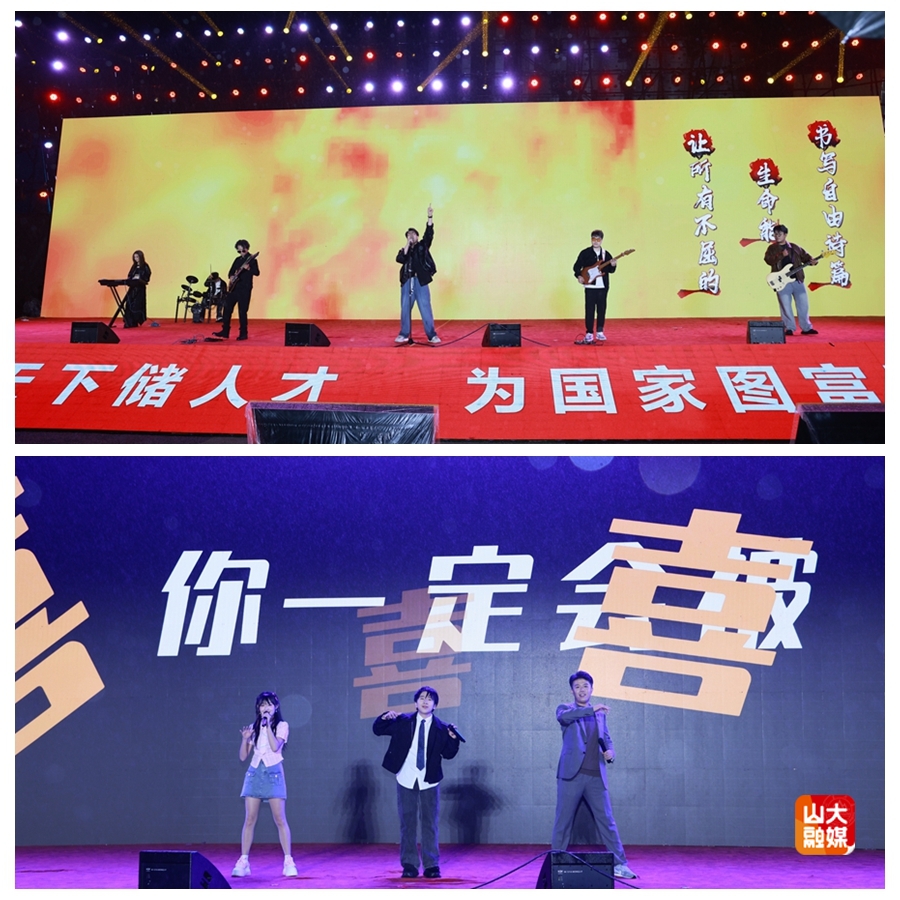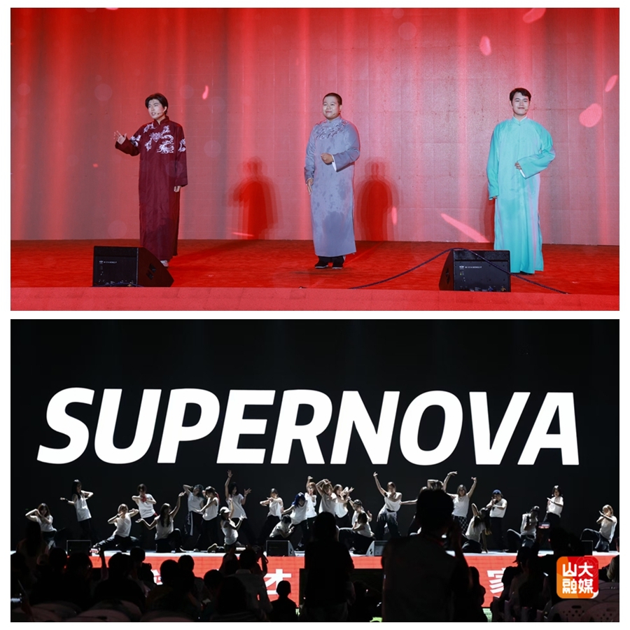 第二篇章“青春乘风·韶华织梦处”展现校园多彩文化与青春活力。校园十大歌手带来歌曲串烧《篇章》《夏天》《我会等》,引燃现场热情。心之城乐队、Supernova街舞协会、机器人协会、相声协会、AI Unix创新协会、自行车协会、书画协会、纸艺社团等学生社团轮番登场,展现出社团文化百花齐放的蓬勃朝气,生动诠释“学在山大,快乐成长”特色育人理念。新生辅导员代表倾情演唱《超级英雄》《大展鸿图》,以歌声传递真诚祝福与期许,师生互动温馨热烈。