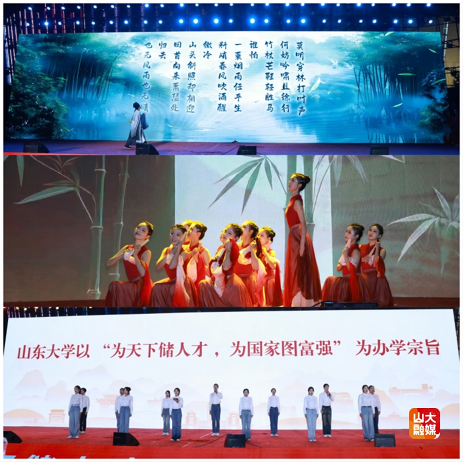 第三篇章“梦向远方·踏歌即星河”抒写家国情怀与青春担当。新生与家长代表共同演唱《是妈妈是女儿》《父亲》《一路生花》,以真挚亲情打动人心。全场观众跟随“苏轼”诵读《定风波》,在秋雨中共期“山头斜照却相迎”的美好未来。舜逸舞团以舞蹈《光亮》献礼新生,刚柔相济的舞姿传递坚韧奋进的精神力量。现场师生共同诵读《山东大学章程》选段,重温办学初心,凝聚奋进共识。