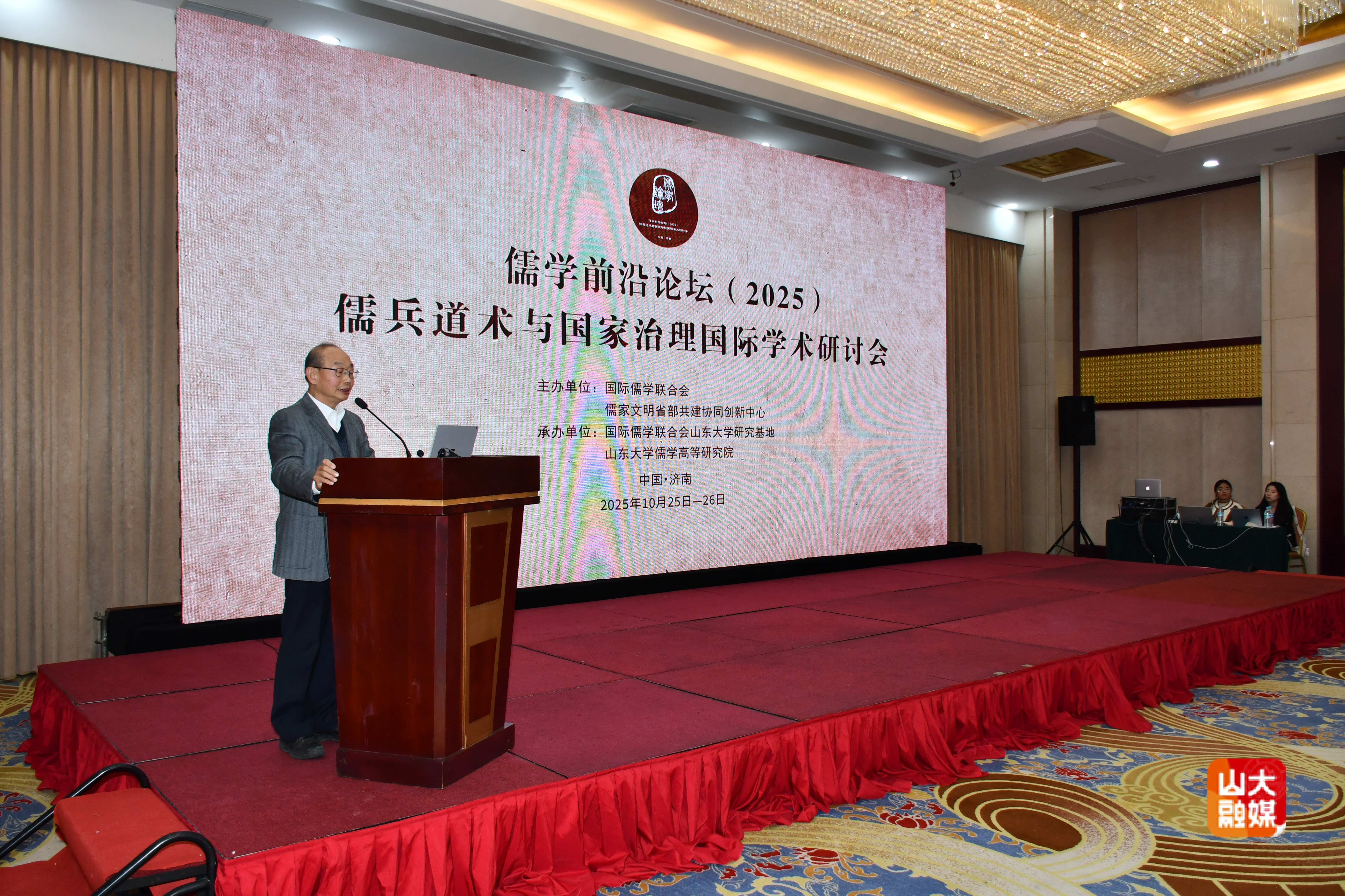 [本站讯]10月25日至26日,由国际儒学联合会、儒家文明省部共建协同创新中心主办,国际儒学联合会山东大学研究基地、山东大学儒学高等研究院承办的“儒学前沿论坛(2025)儒兵道术与国家治理国际学术研讨会”在济南举行。常务副校长吴臻;全国政协常委,国际儒学联合会副会长兼学术委员会主任,山东大学讲席教授、儒学高等研究院院长王学典;国际儒学联合会秘书长马箭飞;中共山东省委宣传部副部长张同海出席开幕式。