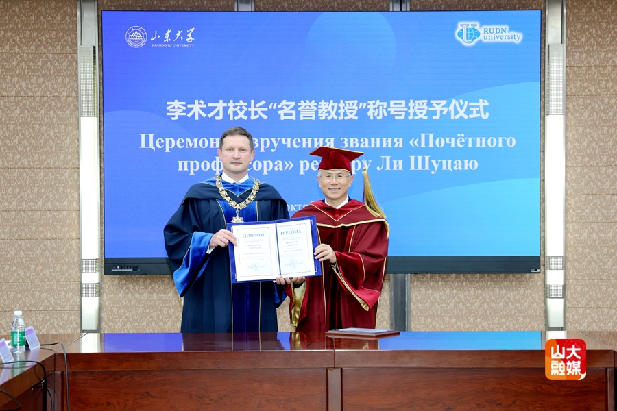 [本站讯]10月28日至29日,俄罗斯人民友谊大学校长亚斯特列博夫·奥列格率团访问山东大学。山东大学校长李术才在中心校区会见亚斯特列博夫一行,双方签署合作计划。活动期间,李术才获授俄罗斯人民友谊大学“名誉教授”称号。俄罗斯人民友谊大学副校长列凯茨·玛丽娜参加活动,山东大学副校长易凡主持活动。
