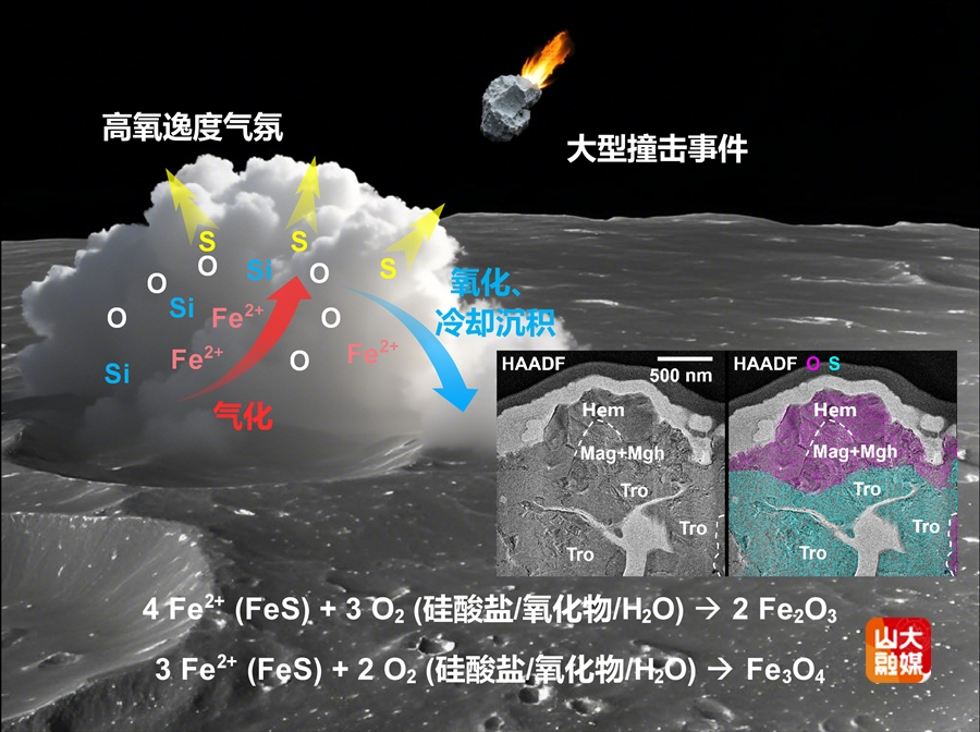 [本站讯]近日,山东大学与中国科学院地球化学研究所、云南大学月球样品联合研究团队,通过分析嫦娥六号返回的月球南极-艾特肯(South Pole–Aitken, SPA)盆地月壤样品,首次发现了大型撞击事件成因的赤铁矿(α-Fe2O3)和磁赤铁矿(γ-Fe2O3)晶体,并据此提出了月球氧化新机制以及磁异常成因的新假说。相关成果以“Discovery of crystalline Fe2O3 in returned lunar soils”于2025年11月14日发表在国际综合性期刊Science Advances(中科院一区TOP期刊,影响因子12.5)。山东大学空间科学与技术学院博士研究生刘毅恒、博士后曹海军,中国科学院地球化学研究所特聘高级工程师李瑞为共同第一作者,山东大学凌宗成教授、中国科学院地球化学研究所李阳研究员、山东大学陈剑助理研究员为该论文的共同通讯作者,论文合作者还包括云南大学李琛博士等,山东大学为论文第一完成单位。