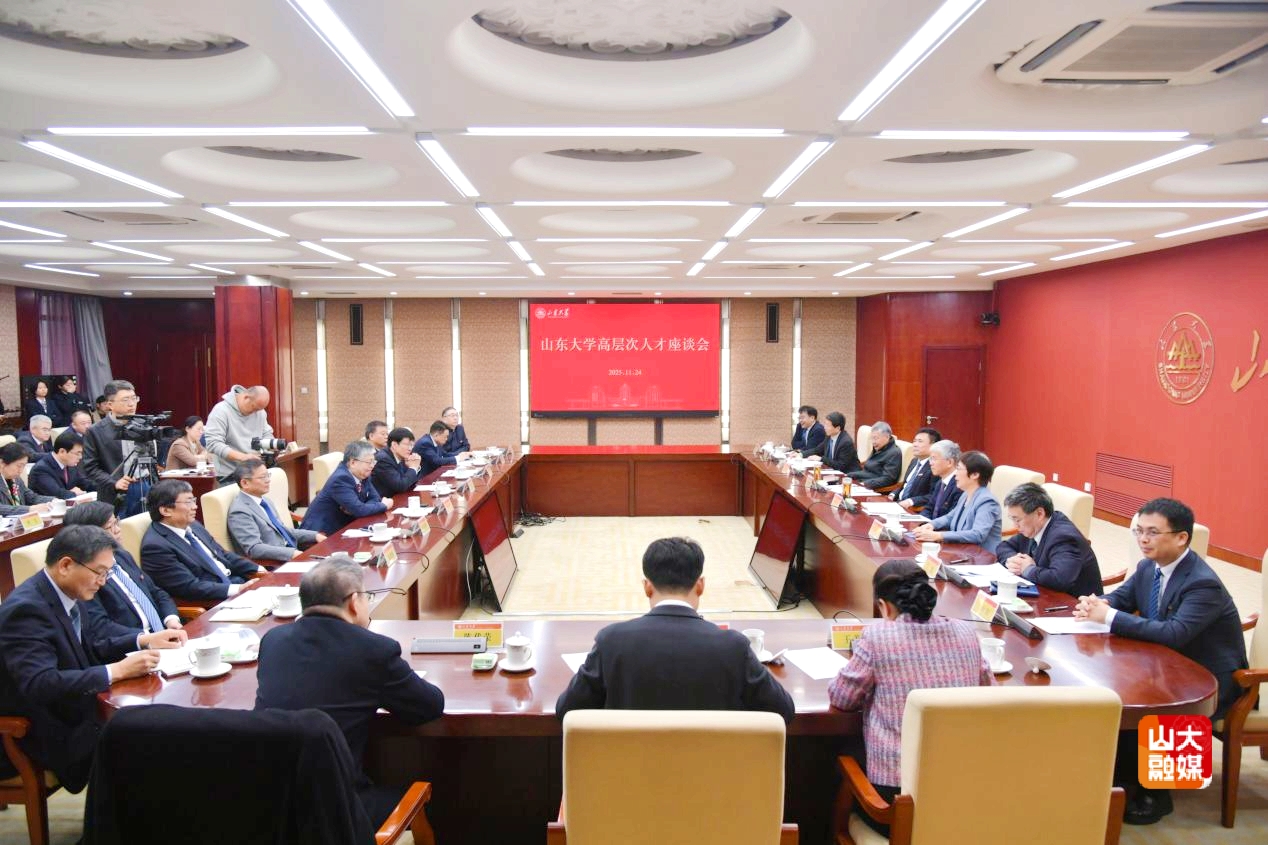 [本站讯]11月24日,山东大学高层次人才(自然科学领域)座谈会在中心校区召开。校党委书记李忠军、校长李术才出席会议并讲话。中国科学院院士彭实戈、中国科学院院士王小云、中国工程院院士王桥,2025年新当选中国科学院院士刘建亚、中国科学院院士梁作堂、中国工程院外籍院士张友明等专家学者参会。
