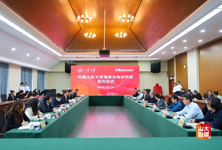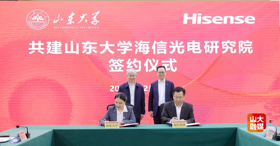 李术才与贾少谦共同为山东大学海信光电研究院揭牌,并为研究院院长、信息科学与工程学院教授黄卫平,企业联席院长、海信集团激光显示首席科学家刘显荣颁发聘书。王美琴与李炜签署《山东大学海信光电研究院共建协议》。