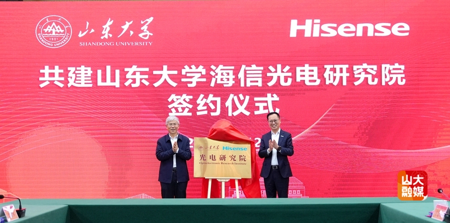 [本站讯]12月12日,山东大学海信光电研究院揭牌仪式在青岛校区举行。校长李术才,海信集团党委书记、董事长贾少谦出席仪式并致辞。副校长、青岛校区校长王美琴,海信集团副总裁、海信视像科技总裁李炜参加活动。
