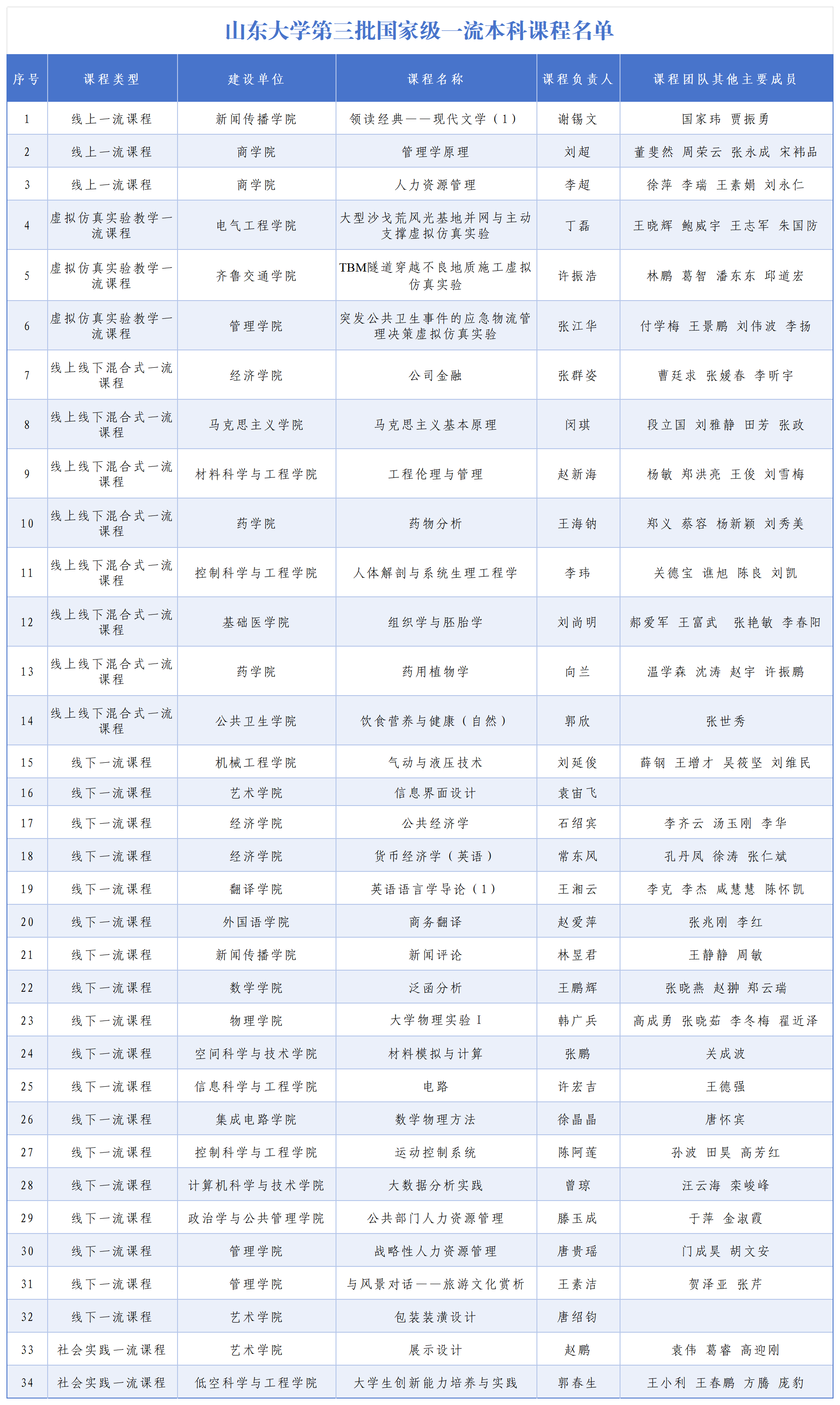 [本站讯]近日,教育部发布《教育部关于公布第三批国家级一流本科课程认定结果的通知》,山东大学共有34门课程入选,包括线下课程18门,线上课程3门,线上线下混合式课程8门,虚拟仿真实验教学课程3门以及社会实践课程2门,新增课程数量位居全国第十。截至目前,学校累计获批国家级一流本科课程149门,总数位列全国第七。
