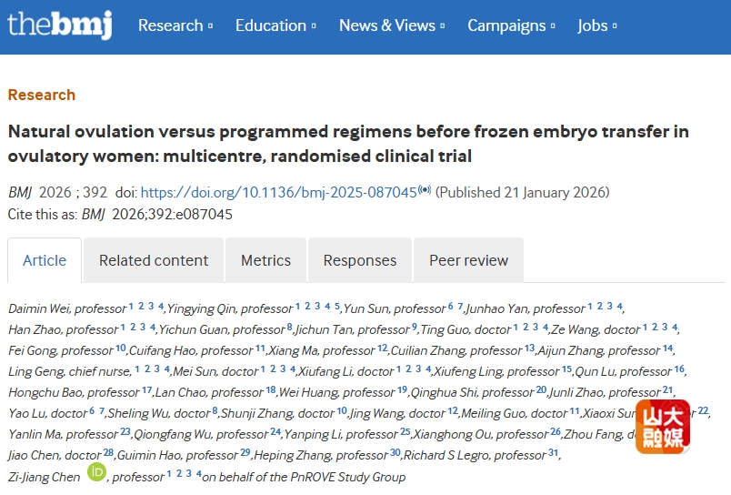 [本站讯]1月22日,生殖医学与子代健康全国重点实验室、山东大学妇儿与生殖健康研究院、山东大学附属生殖医院陈子江院士团队于国际顶级医学期刊BMJ在线发表一项最新多中心随机对照临床研究成果“Natural ovulation versus programmed regimens before frozen embryo transfer in ovulatory women: multicentre, randomised clinical trial”。研究结果显示,对于月经规律的女性,在冷冻胚胎移植周期中,采用自然排卵方案准备子宫内膜,相较于雌孕激素替代方案,可显著降低子痫前期、早期流产、胎盘植入、产后出血及剖宫产等多种孕产期并发症的风险。山东大学是本研究的第一作者单位和独立通讯作者单位。
