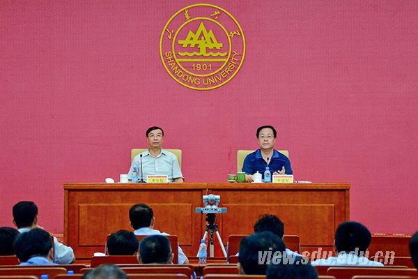 山东大学教育实践活动领导小组副组长兼办公室主任、校党委常务副书记李建军(右)主持会议