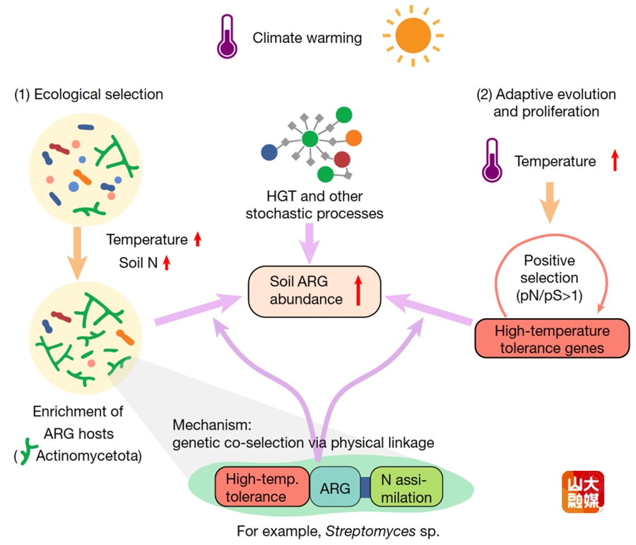 进一步机制解析发现,增温通过氮同化等代谢过程筛选出具有热耐受优势的放线菌群。ARGs在基因组上与耐热基因、氮同化基因具有高度保守的物理邻近性。这种物理关联使得ARGs能够在气候变暖引发的正向选择压力下,通过“遗传搭车(Genetic Hitchhiking)”效应在微生物群落中快速扩散。本研究首次系统阐明了气候变暖如何通过生态选择与进化耦合的双重作用,驱动土壤抗性组的增强。