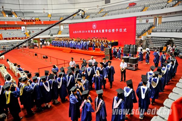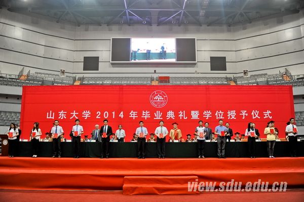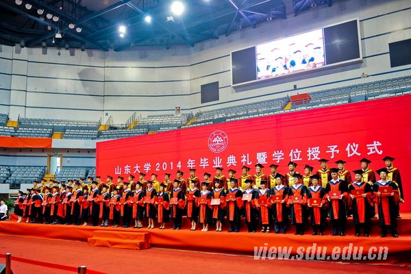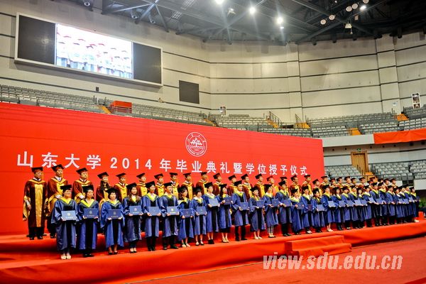 [本站讯]6月23日上午,山东大学2014届研究生毕业典礼暨学位授予仪式在中心校区体育馆隆重举行。山东大学学位评定委员会成员依次为博士毕业生、硕士毕业生授学位并与毕业生合影。