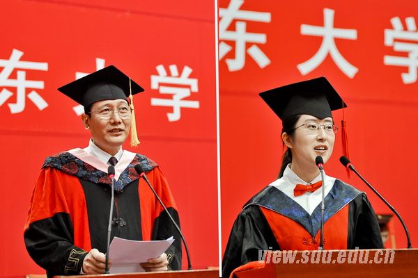 教师代表、儒学高等研究院杜泽逊教授(左),毕业研究生代表、医学院2014届博士毕业生张宁(右)发言