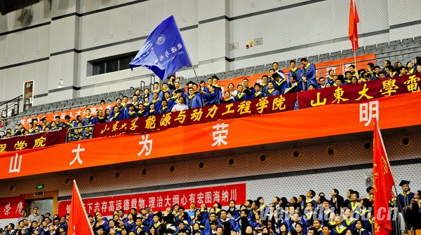 典礼上,方宏建宣读了《山东大学关于表彰2014届优秀毕业生和赴西部、基层、国家重点行业就业毕业生的决定》,优秀毕业生代表上台领奖。学位授予仪式上,陈炎宣读了《山东大学2014届毕业生学位授予决定》。各学院院长分别上台为毕业生送上深情寄语。不同的形式,共同的祝愿与嘱托;不同的风格,相同的期盼与希望。院长们用最温暖的方式为毕业生们送别,为毕业生们祝福,带着眷恋与不舍,伴随着真情与寄托。毕业生的现场互动则更进一步诠释了师生之间浓烈的深情厚谊。“同追国民健康梦,共叙青春不了情”、“养天地正气,担人间正义”、“念山大桃李芬芳,护中华之康健”、“请留管院里,心系大天地”、“追寻生命之光,放飞青春梦想”、“挥手道珍重,梦想再起航”……各个学院各具特色的横幅标语写满了对母校的不舍和祝福,寄托了对未来的信心和期望。