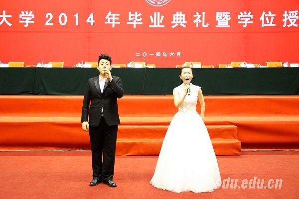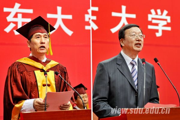 山东大学副校长陈炎(左)宣读《山东大学2014届毕业生学位授予决定》,校领导方宏建(右)宣读《山东大学关于表彰2014届优秀毕业生和赴西部、基层、国家重点行业就业毕业生的决定》