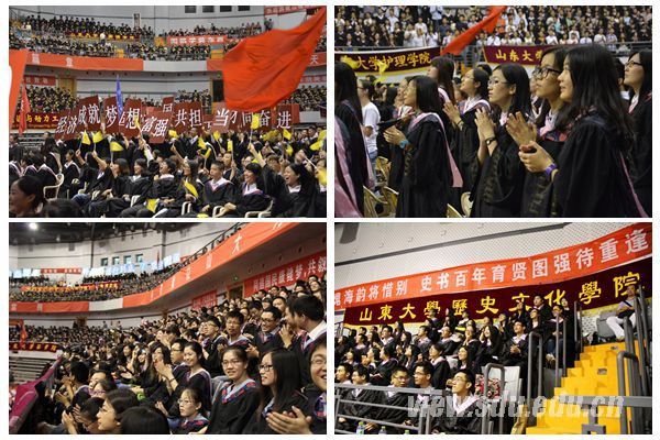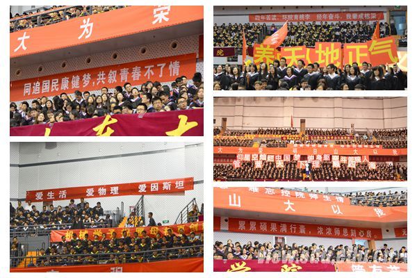 “今日我以山大为荣,明日山大以我为荣”、“弘扬崇实求新精神,书写青春壮丽篇章”,体育馆两侧的大横幅令人心潮澎拜。各学院以不同的标语表达各具特色的学院风采和对毕业生的祝福。“当分离不可求解,以数学筹算天下”,数学学院标语体现着数学的基础性作用和毕业生对专业的自豪感;“爱生活,爱物理,爱因斯坦”,物理学院巧妙地表达了自己对于所学专业的热爱和对科学的不懈追求;“今日材堪菁茂者,明朝执掌铸重坚”,材料学院喊出对梦想和未来的信心和期待;“谨以余诚,不忘璧影之吻;挚付明心,争为提灯女神”,护理学院显示出白衣天使的专业态度和奉献精神;“同追国民健康梦,共叙青春不了情”,药学院表达了对青春记忆的不舍和对专业的孜孜追求;“动力起航,拥抱梦想”、“芯系中华,集成天下,信息英才,成就未来”,能动学院和信息学院巧妙地把专业特点和对未来的祝福结合在一起……各具特色的标语成为毕业典礼中一道靓丽的风景线,展现了2014届毕业生们对未来的期待,凝聚着毕业生们对母校的热爱。