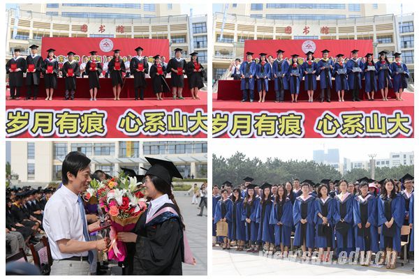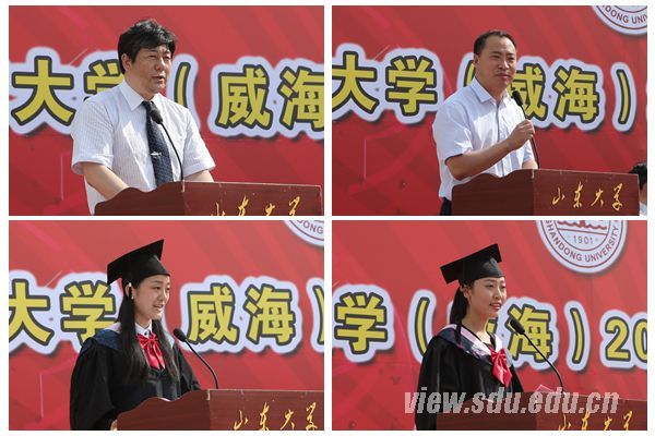典礼上,教师代表、海洋学院院长梁振林教授代表全体教师向毕业生传达了美好的祝愿,鼓励同学们以实现中华民族伟大复兴的中国梦为己任,在今后不断奋斗的人生道路上最终实现自身价值。校友代表、1996届经济系毕业生、威海市文登区副区长宫本杲叮嘱毕业生要面对困难,坚强迎接命运的挑战;把握国家发展大势,选择合适的职位;具备开放、国际化的精神,成为国际化的人才。毕业生于书博代表全体毕业生向母校的领导和老师表示诚挚的谢意,并承诺将坚持“刚毅厚重,朴实无华”的山大风格,“以梦为马,诗酒趁年华;离开象牙塔,朝着梦想出发”。