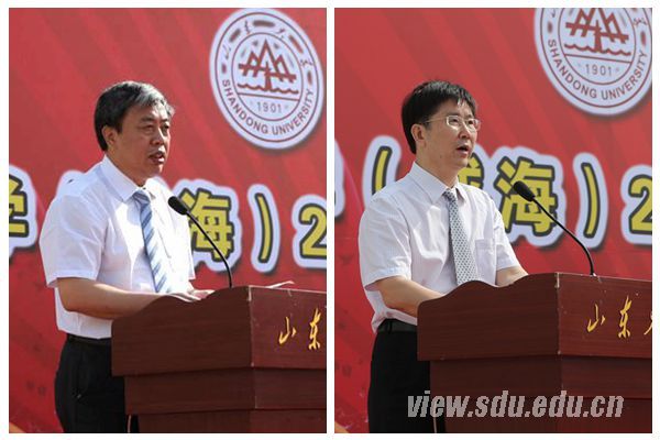 山东大学党委副书记、山东大学(威海)党委书记仝兴华(左)主持典礼,山东大学副校长、山东大学(威海)校长韩圣浩(右)出席典礼